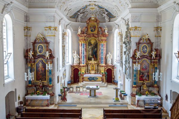 - Die barocke Stadtpfarrkirche Mariä Himmelfahrt mit Deckenstuck und Ausmalung von Konrad Huber, mit dem Reiterstandbild und der Grablege der Grafen von Rechberg und Rothenlöwen